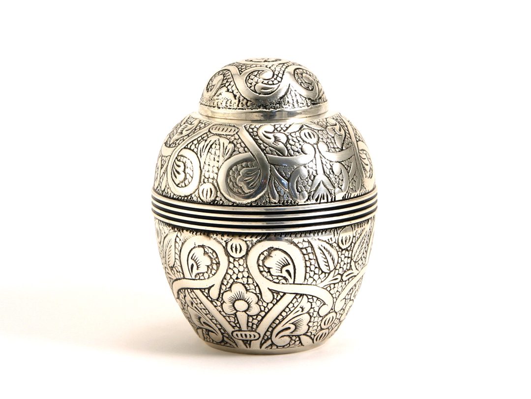 The Silver Embossed urns are part of Original designs. They are made of brass, electoplated and polished nickel and hand-engraved with a unique design.